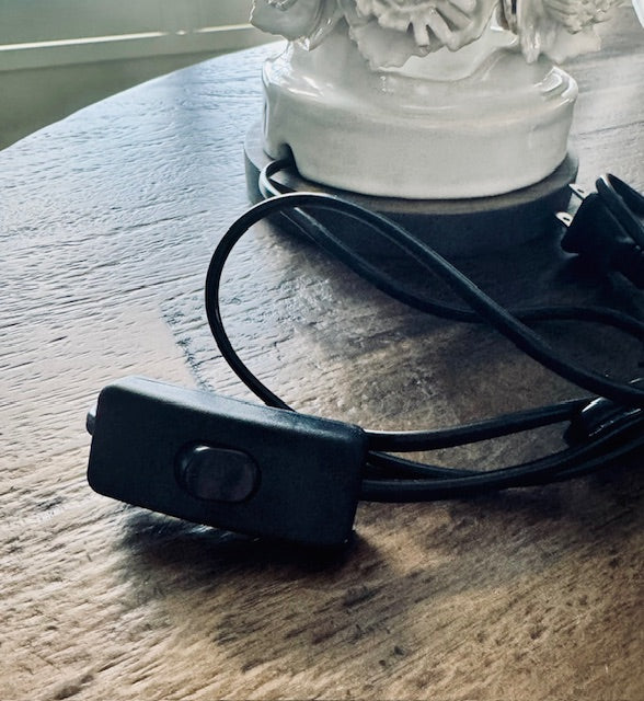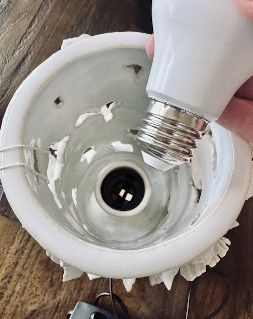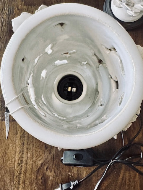 The lamp is glazed in a beautifully creamy white glaze that gently breaks over texture and edges, revealing a soft hint of the clay below. This lamp is mounted on a dark walnut-stained wood base and is powered with a six foot cord. A frosted 40W LED lightbulb is included.