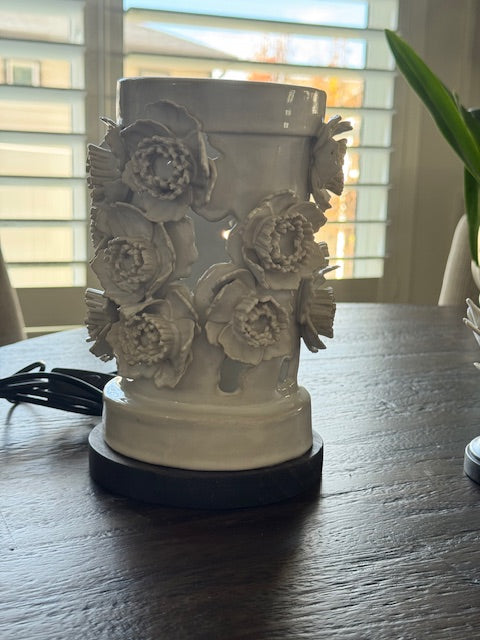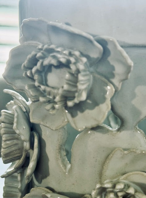 A sculpture of light and shadow, the Poppy Bloom lamp is more than illumination—it is an invocation. Handcrafted from white stoneware, this radiant vessel is adorned with delicately sculpted blooms that encircle its body like whispered memories. Each petal catches the warm inner glow, casting soft, dappled light through its openings—like morning sun filtering through a wild garden.